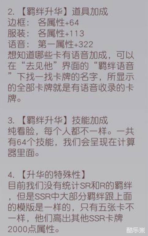目前我们没有统计SR和R的羁绊,但是SSR中大部分羁绊跟上面的模版是一样的,只有五张卡不一样,他们高出其他SSR卡牌2000点属性。