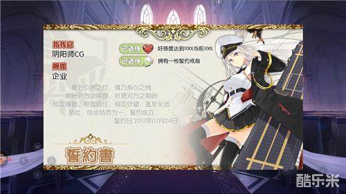 给企业戴上誓约戒指,婚礼就正式结束了,PS:戴戒指是手动!手动哦!!!与企业正式成为一生命运羁绊的恋人,然后系统颁发一张誓约书!