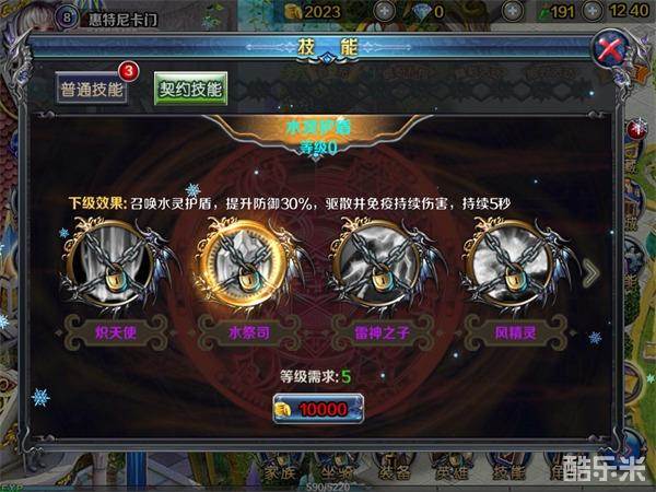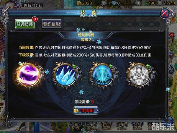 普通技能有烈焰风暴、星辰坠落、闪烁、禁锢四种技能,角色可升级主角技能。