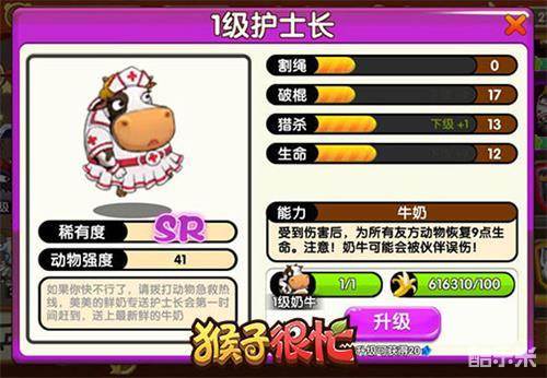 受到伤害可以会所有友方动物恢复6点生命,但是会被伙伴误伤。通过能力介绍,我们可以了解到,“奶牛”属于辅助型动物,而且关键时刻可以被自己的伙伴打中,保证其它伙伴的血量回复,完全是一个牺牲自己,成全他人的角色。