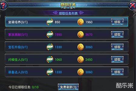 玩家达到30级左右开启悬赏任务,悬赏任务每天可以接10次,完成悬赏任务可以获得大量经验奖励。值得注意的是,悬赏任务的奖励和颜色有关,所以小编在这里建议各位玩家,如果经济情况允许的情况下,建议刷新到高质量的任务再接。