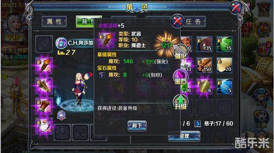 打开背包,点击所要升级的装备,再点击升级,就可以来到装备升级界面了。需要注意的是,装备每次升10级,且最高等级不能超过人物等级,装备升级时,会有一定概率掉该装备的强化等级,使用钻石可以保证升级不掉强化等级。同时,装备升级还需要大量的材料,这些材料可以在精英副本和普通副本中获得。