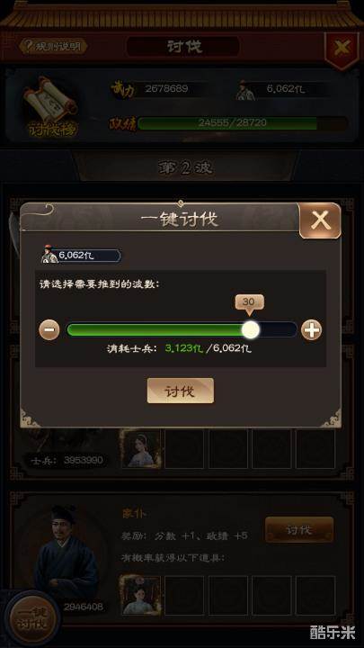 规则说明:战斗方式以玩家武力属性和士兵数作为战斗数值;每波随机出现3名敌人,选其1并战斗胜利即可进入下一波(讨伐波数每日凌晨重置为1)。