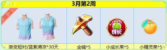 任务奖励:渐变短衬/蓝紫清凉*30天+金镐*5个+小成长果*5个+小精灵果*5个