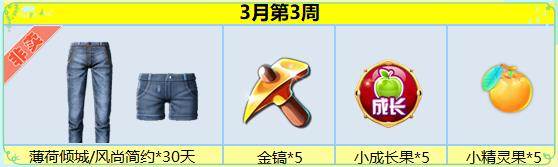 任务奖励:薄荷倾城/风尚简约*30天+金镐*5个+小成长果*5个+小精灵果*5个