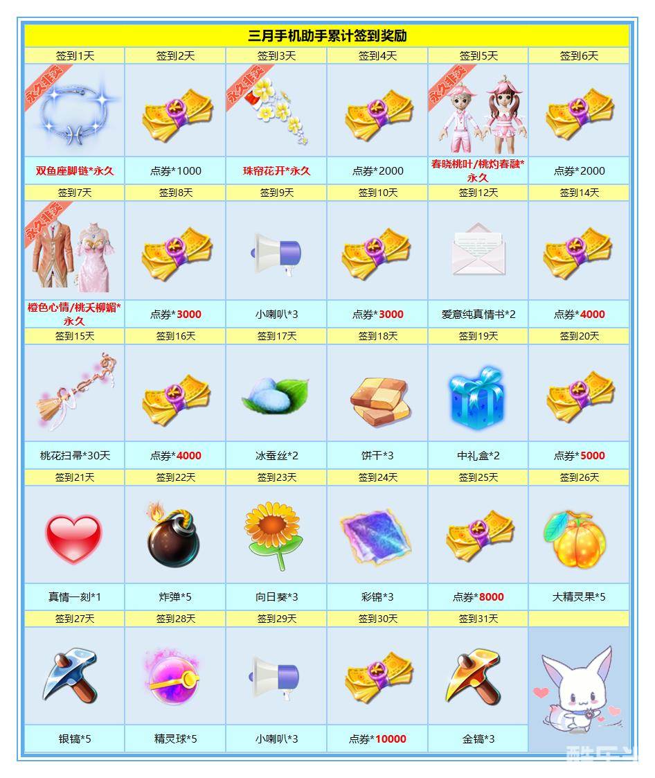 3月手机助手累计签到,不仅可以领取永久桃花情侣套,还有永久宝儿套+永久精美饰品+限时非卖座椅+丰厚点券等你来拿!