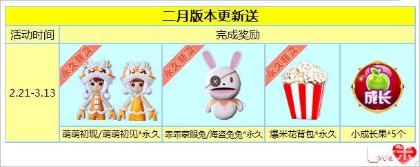 2.21-3.13,版本更新即送萌萌哒的永久宝儿套装—萌萌初现/萌萌初见,还有乖乖蒙眼兔+时尚背饰爆米花背包哟!小伙伴们不要错过咯!