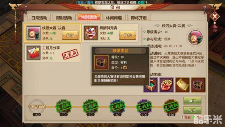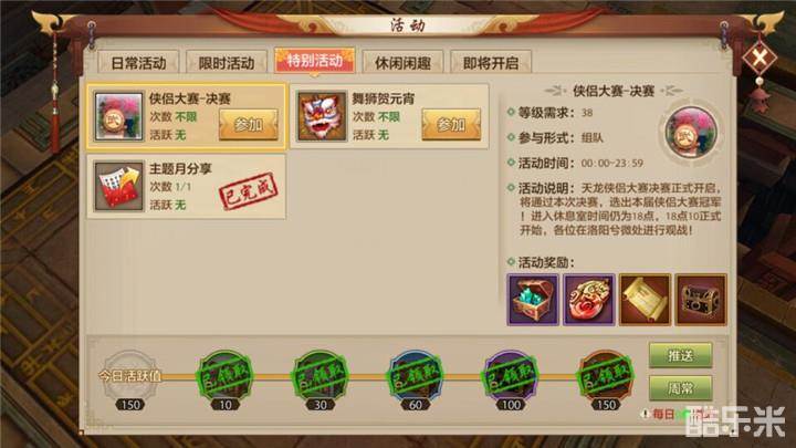 活动介绍 每个等级段有资格进入决赛的2支强劲侠侣队伍,在18点整就可以进入决赛休息室等待,18点10分精彩纷呈的侠侣大赛决赛将正式开始,届时将会决出令广大少侠们趋之若狂的本届侠侣大赛的冠军队伍,有缘进入决赛的侠侣队伍千万不要迟到哦,迟到将被视为弃权,所以,少侠要准时进入,不要错过了夺取冠军的机会。