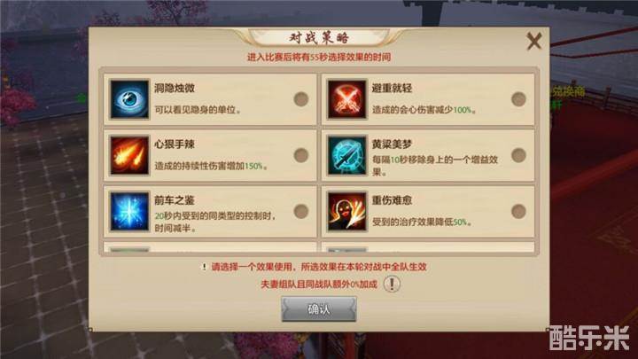 18点10分比赛将正式开始,少侠队伍中的队长有55秒的时间选择应对策略,来给自己和队友增加增益效果。既然已经知道对手是什么门派,那么就可以针对对手情况和己方情况来选择策略。例如,如果对方有天山,就选择洞隐烛微可以看见隐身的单位,这样就避免了误打误撞,做到有的放矢,更好地有力攻击目标。比赛依然是3局2胜制,最后赢得2局的侠侣队伍将最终获得本届侠侣大赛的冠军。