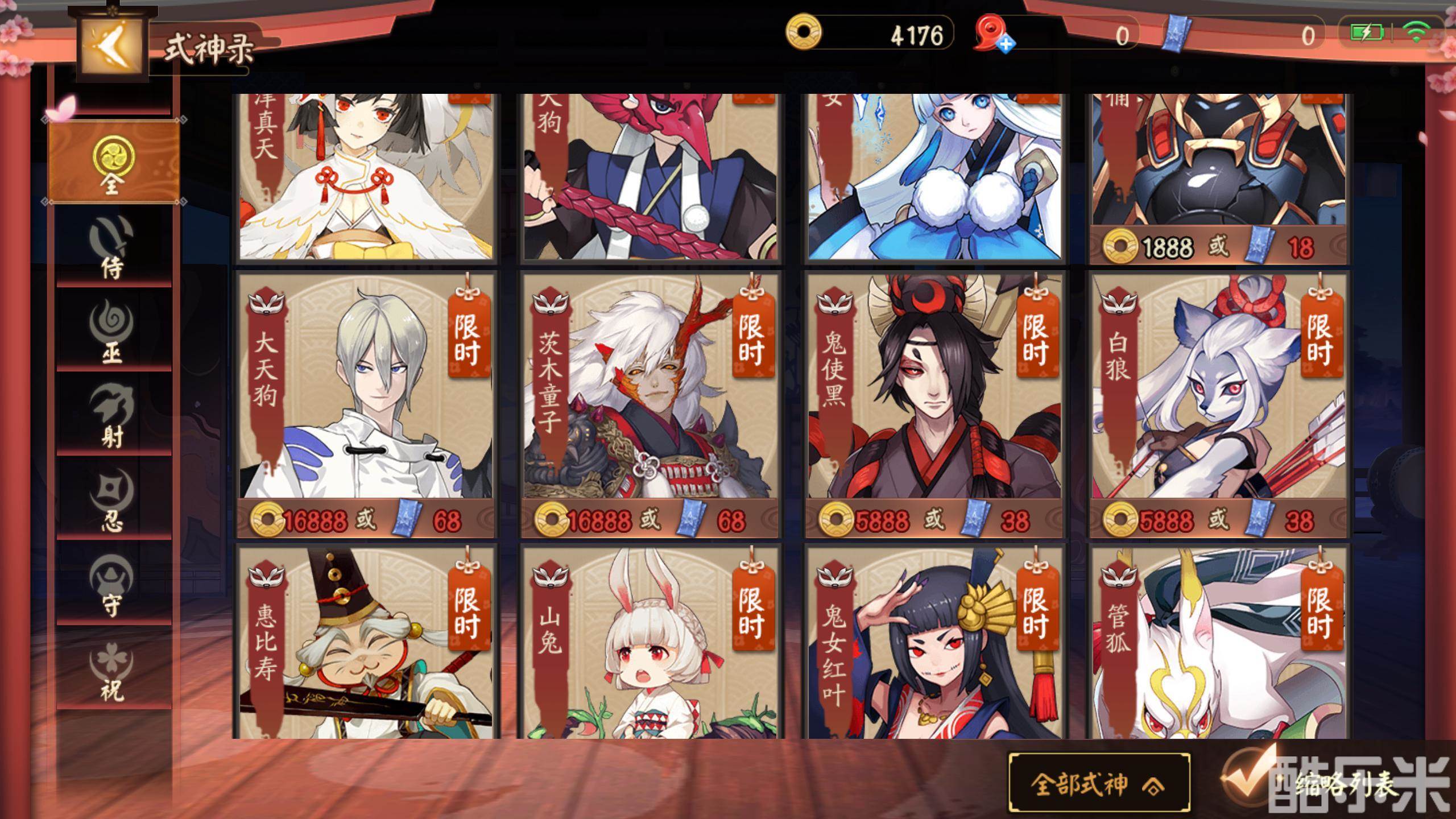 侍类:妖刀姬,夜叉,犬神,茨木童子。这三个式神都是比较强力的上单式神,可以在对线时取得优势。尤其是妖刀姬,算是目前最贵的一批式神之一,但是其实力强大也是毋庸置疑的,上测的小伙伴还记得被妖刀支配的恐惧吗?虽然这测没有那么强力了,但是还是非常推荐入手的,一旦顺风,还是能对敌方后排造成致命打击。