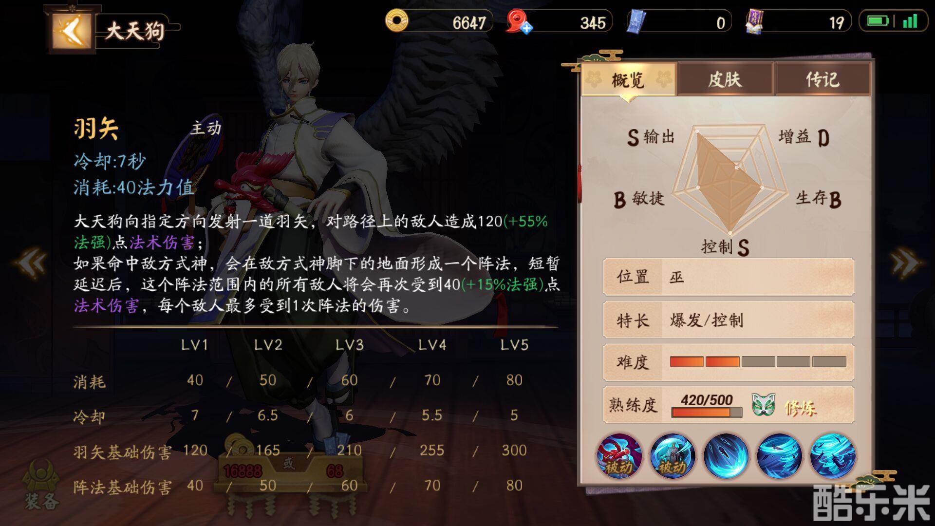 主动:大天狗向面前发出一道羽矢,对路径上的敌人造成120/165/210/255/300(+55%法强)点法术伤害。如果命中敌方式神,会在其脚下地面形成一个法阵,短暂延迟后,这个法阵范围内的所有敌人将会再次受到40/50/60/70/80(+15%法强)点法术伤害,每个敌人最多受1次法阵伤害。