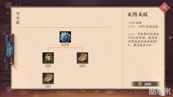 太阴·太极单看基础属性,完全没有优点。但是如果看到其被动,那把它放在法师必出装备里,就显的理所当然了。被动太阴,忽视35%法抗,在对方式神出了法抗装后,依靠这个被动依然能打出成吨伤害。被动太极,目标每比你高出100点生命值,提高你对其造成的法术伤害1%。作为法师型式神,血量本就不多,可能面对的任何一个式神血量都比你高出很多,非常的具有优势。属于越后期越强大的法器。