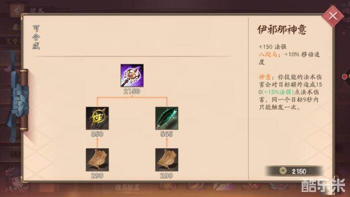 伊邪那神意可以提供150点法强和两个被动效果。单看基础属性并不出众,但是其被动效果非常强大。八咫乌,增加移动速度,无论逃跑还是追击都更加的轻松。神意,法术技能的伤害会对目标额外造成150(+15%法强)点法术伤害,远比加150点法强更实用。