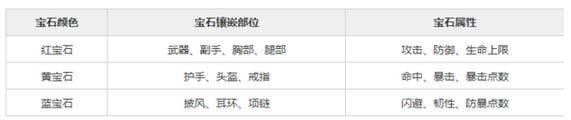 下面我们来说说本篇攻略的重点,在游戏中,宝石一共分为红、黄、蓝3种颜色,且每种颜色的宝石必须对应装备才可以镶嵌,而且每种颜色的宝石还分为3种属性,宝石颜色以及属性列表如下: