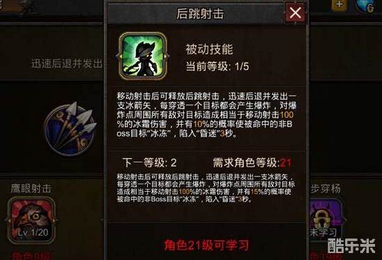 后跳射击是游戏移动射击技能的第二段被动技能,其技能效果带有一定的控制效果,对于游侠来说是非常值得强化的技能,虽然对BOSS目标冰冻的控制效果不会发生,但可以有效牵制小怪,从而更容易进行输出。