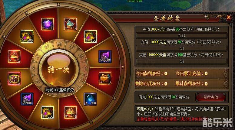玩家每次在圣兽转盘进行抽奖都需要消耗100圣兽积分。玩家通过重置即可获得圣兽积分。充值1000元宝可获得20圣兽积分,充值1000元宝可获得50圣兽积分,充值100000元宝可获得100圣兽积分。注意充值元宝获得圣兽积分的次数各档次每日仅限1次。