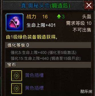 超级地城之光真·奥秘头巾装备属性解析,真·奥秘头巾是法师的初级装备,由1级绿色装备锻造而成,是玩家初期必备的装备,在属性战力上比绿色装备有了相应的提升,在强化升级后可以用来升阶成更高级的装备。