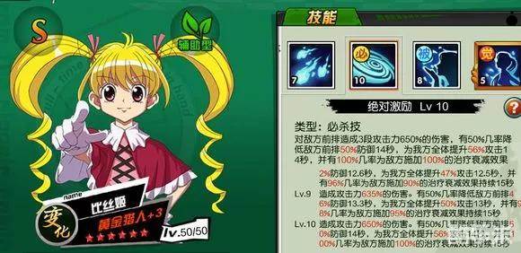 比丝姬多放在援助位。作援助比丝姬可以不觉醒,但技能2最好能点满,这样才是100%的禁疗。被动技回复并不多,点到7就可以。