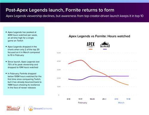 《Apex英雄》在直播上的观众人数最近一直在稳定下滑,这款素有《堡垒之夜》杀手之称的游戏如今热度只有后者的五分之一,更别提将其取代,慢慢地消失在后视镜中。