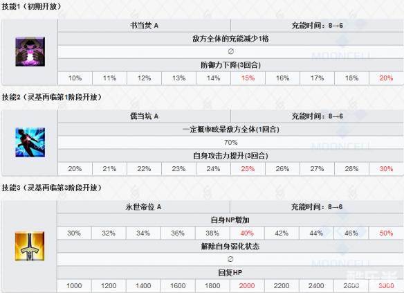 三技能50自充+解弱体+回血,高难特化技能+回复NP