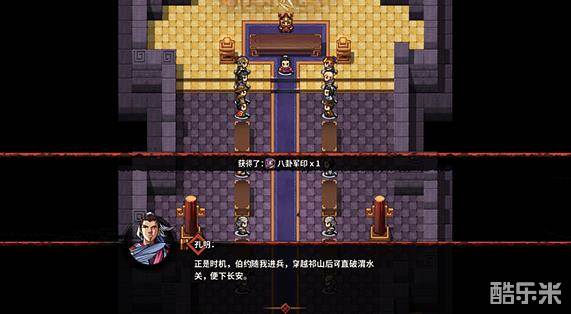 白帝城出发发现右侧通路已经可以通行,已无需渡船,穿越街亭来到斜谷关内。一房屋内NPC对话可使用六甲天书换得天赋「落雷」。中间左侧房屋内可见到郭嘉,对话触发条件后二周目时可加入我方,暂且不管。关中得知魏臣司马懿在曹操死后夺取了朝政大权,曹丕等人也是一心想为父报仇。一直往南走过了桥就能看到渭水关。守将杜预,羊祜等人早有防备。蜀魏双方休整多年后再次开战。