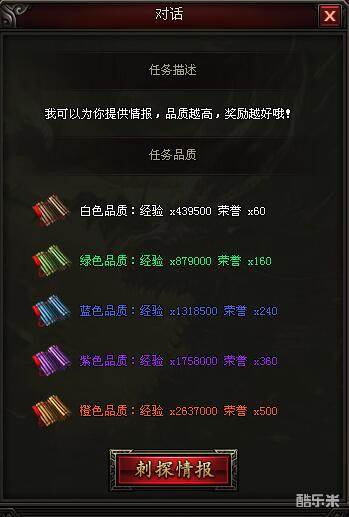 情报的品质分为5种,橙色>紫色>蓝色>绿色>白色,品质越高奖励越高。玩家刺探情报后,随机获得白色,绿色,蓝色,紫色,橙色中的其中1种情报,也可通过更换情报,换取其他颜色的情报,每次换取有CD时间,换取次数越多,CD的时间就越长。