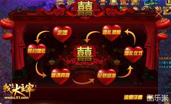这就是传说中史上最全的51游戏大主宰结婚流程图,求婚-预约婚礼-宴请宾客-花轿巡游-婚礼仪式-婚礼酒宴,礼成!必须要经历着六大步骤才能获得甜蜜幸福的生活,也才是大主宰中真正意义上的夫妻。