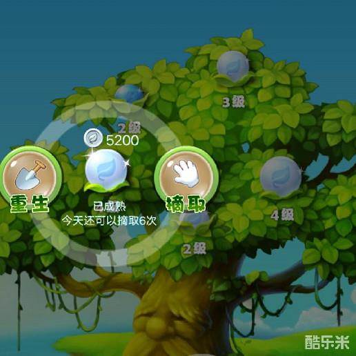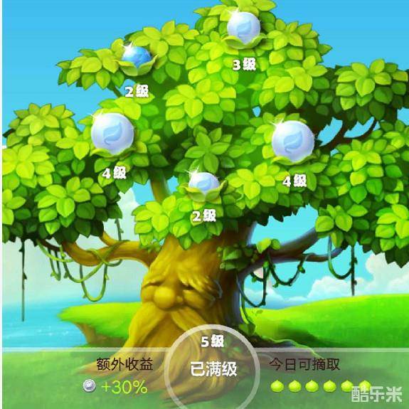 上图所示的这棵树是我的,我的这棵树已经达到满级了,最高级目前是5级,5级的树可以获得额外金币+30%的奖励,每日可摘取的次数是6次。