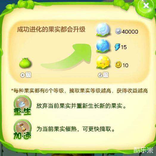 果树上的果实从无到有,从0级开始生长,涨到成熟为止,长成的是果实种类和级数都是随机的,种类可以在1级时看到,等级可就真的是看脸的啦,银币最高40000,能量最高15,金币最高10。