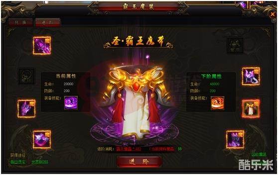 击杀世界BOSS或者寻宝可获得霸王魔装与霸王魔晶,多余的霸王魔装可分解为霸王魔晶,而霸王魔晶可用于魔装进阶,进阶后的魔装可提升【魔王降临】技能等级,为玩家提供更强大的技能效果!