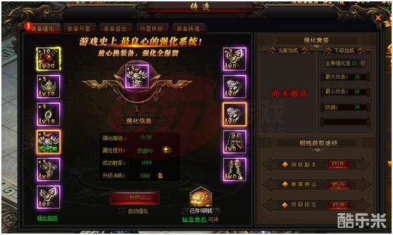 角色通过消耗铜钱对该装备位进行强化;强化上限取决于当前装备位上所穿戴的装备等级,装备等级或转生等级越高,该装备位的强化等级也越高;强化装备可提升角色属性;更换装备不影响强化装备带来的角色属性。