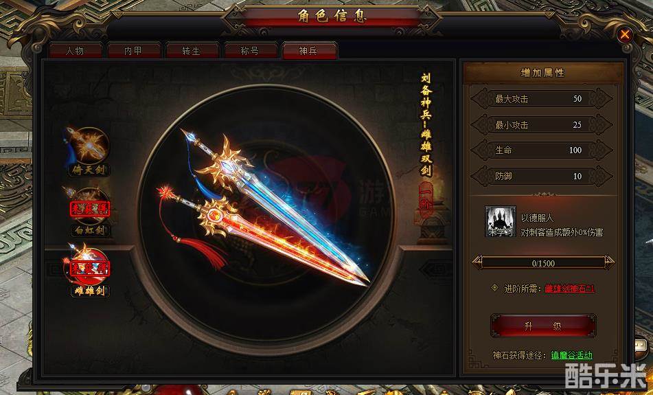 玩家等级达到56级的时候,就可以解锁神兵系统,玩家可从角色信息界面里,找到该玩法。目前,北斗神兵神兵系统共有3把神兵,分别是倚天剑、白虹剑、雌雄剑,每把神兵都带有一些zui大攻击、zui小攻击、生命、防御的属性效果。大家成功激活各把神兵后,即可永久获得这些神兵的属性效果。