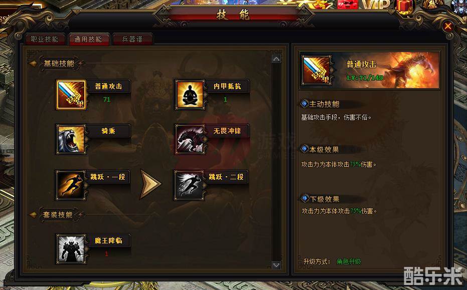 游戏里的普通技能有基础技能和套装技能,其中套装技能只有1个,那就是魔王降临,而基础技能共有6个,分别是普通攻击、内甲抵抗、骑乘、无畏冲锋、跳跃·一段、跳跃·二段。不同的普通技能有着不同的效果,各种普通技能效果介绍,如下: