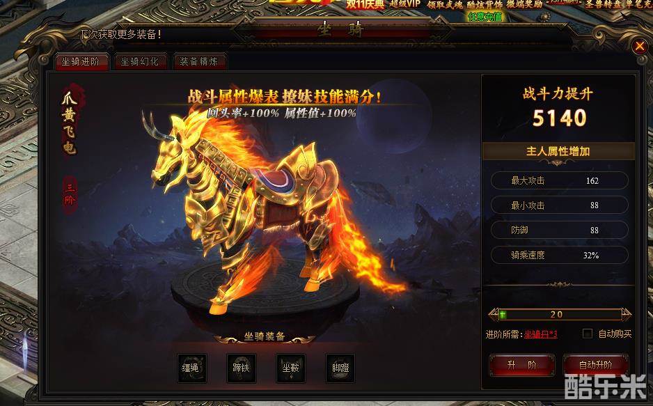 随着坐骑等级提高,消耗的坐骑丹越多。坐骑进阶时,会增加坐骑的祝福值,祝福值满时,坐骑将会自动进阶。当坐骑达到5阶后,祝福值将会进行24小时清空处理。玩家提升坐骑等级后,可获得更好的坐骑属性加成。坐骑成功提升每一阶,都会获得一个新的坐骑造型的。