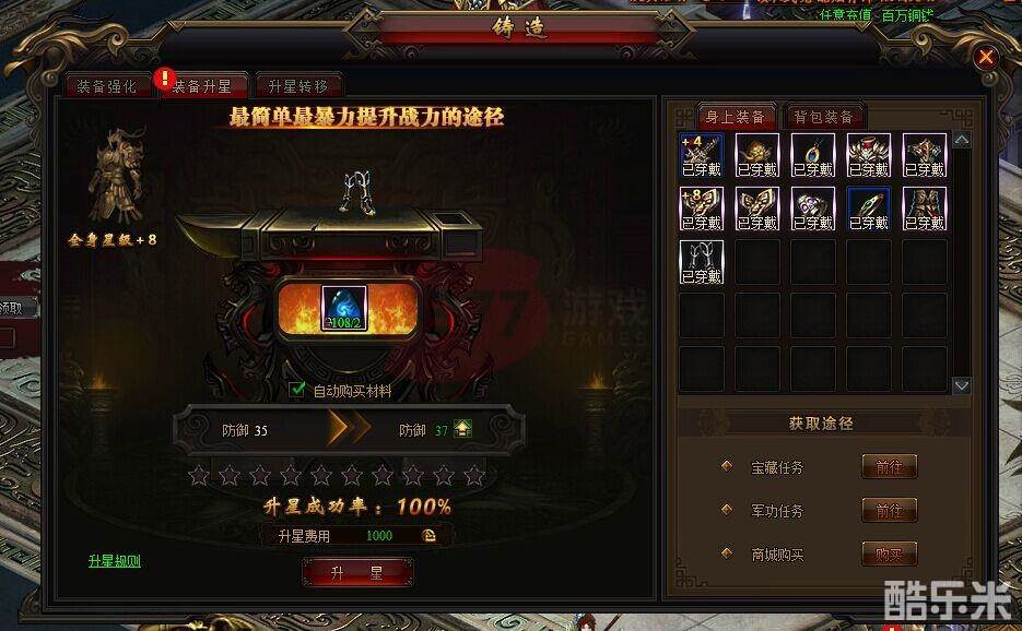 玩家完成44级的主线任务,可解锁铸造系统,可使用装备升星的功能。大家从界面下方的“铸造”按钮,可进入到装备升星界面。然后,从右侧的装备栏里,选择可以升星的装备,放入到装备槽里。点击“升星”的按钮,可消耗铜钱和相应数量的升星石。随着装备升星等级的提升,消耗的升星材料增多。