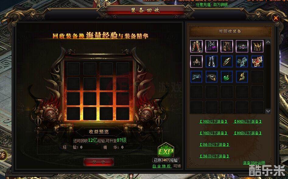 大家从右侧的可回收装备界面里,找到一些符合要求的装备,双击放入到回收装备栏里,在点击“回收”的按钮,就能将选中的装备回收掉,每次zui多可回收16件装备。装备回收后,可获得大量的经验值、铜钱、装备精华等奖励。装备等级越高,可回收获得的经验值、铜钱、装备精华越多。装备回收会有额外的20%经验累计,白金特权可以随时领取,累计经验上限为5亿。