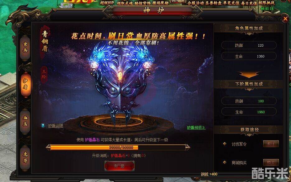 在北斗神兵网页游戏里,花点时间,刷日常、血厚防高、属性强,不用花钱,全部靠刷。玩家可通过护盾系统,来提升自身的防御能力,让你变得更加强大的。下面我们一起来了解下,北斗神兵护盾系统的相关玩法吧。