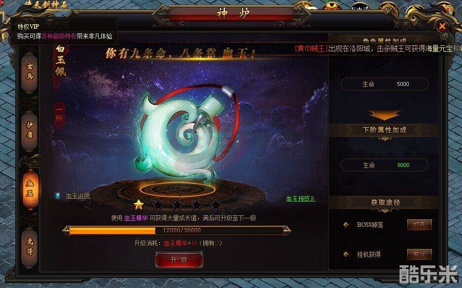 每阶血玉都有5个等级,玩家可先将当前阶级的血玉升满5个等级后,才能进阶到下一阶的血玉的。玩家提升血玉的等级或阶级,都能获得一些血玉属性加成,血玉所提供的属性为生命属性。玩家可消耗一些血玉精华材料,来提升血玉的阶级或等级的。这种材料可通击杀怪物掉落,或者击杀BOSS掉落获得的。