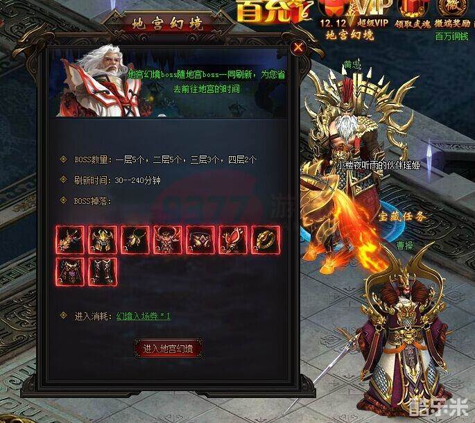 玩家达到60级时候,就可以进入到地宫幻境,去击杀各种地宫幻境BOSS。地宫幻境为一个副本型的BOSS场景,玩家要找到洛阳城里的NPC“黄忠”对话,传送进入到地宫幻境地图。