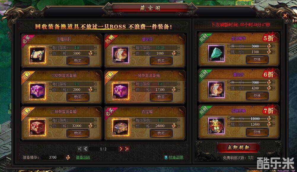 北斗神兵藏宝阁的物品,会有限购次数的。各种道具会在相隔的时间内刷新,而右侧一列3种道具,可以每天立即免费刷新5次,免费刷新次数用完,可使用元宝刷新,每次刷新消耗20元宝。
