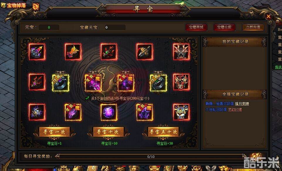 玩家等级达到一定等级后,可以解锁寻宝系统的。大家从界面上方的“寻宝”图标,可以进入到寻宝界面寻宝。寻宝需要消耗一些寻宝符,玩家可寻宝一次、寻宝十次、寻宝五十次3种方式来寻宝。玩家每寻宝一次需要消耗1张寻宝符,寻宝符可通过元宝购买,或者通过每日充值礼包领取。