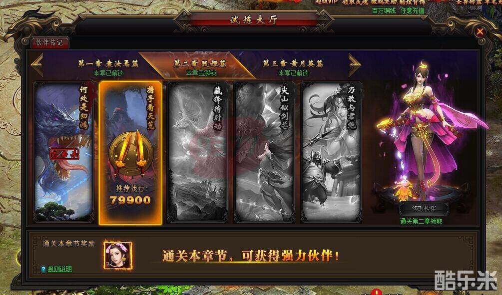 玩家进入到伙伴副本后,需要在限定的2分钟时间内,将副本的BOSS击杀掉,才能通关副本,并获得通关奖励。玩家首次通关每一章后,可激活一个伙伴。玩家已经通关的篇章,之后每天都可以使用一键扫荡功能,快速清理掉这些已通过的副本。玩家扫荡各种副本,可获得一些姻脂水粉、内甲丹等道具。