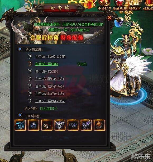 北斗神兵白帝城副本的进入,需要消耗【卧龙信物】的道具,每次进入消耗一个【卧龙信物】。【卧龙信物】可通过绑定元宝商城购买获得的。玩家在进入这个副本时,需要找准对应等级范围的副本进入。北斗神兵白帝城副本共有7层,各层进入的等级要求,如下: