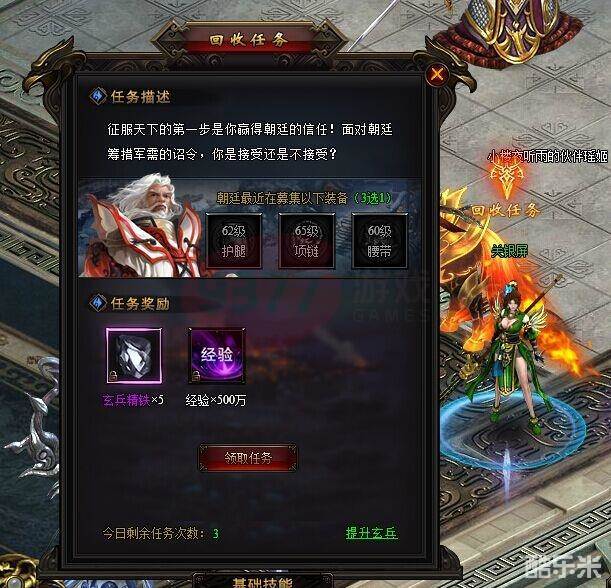 玩家点击领取任务后,可以根据任务提示,通过军团仓库、激战BOSS、交易市场等途径,去收集任务要求的装备。任务要求的装备为3选1,玩家可以随意找到一件容易获得的装备,提交给NPC的。北斗神兵回收任务的任务奖励,主要有5个玄兵精铁、经验值。其中,玄兵精铁可以用来升级神炉里的玄兵装备,增强角色的战斗力的。