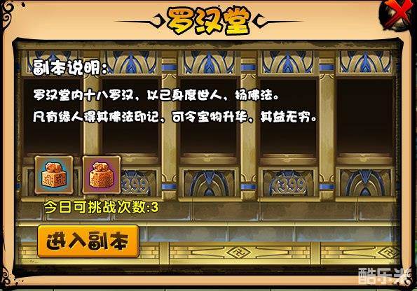 选择坐鹿罗汉进行试炼挑战吧!选择相对于的试炼可掉落相对于的法印哦!
