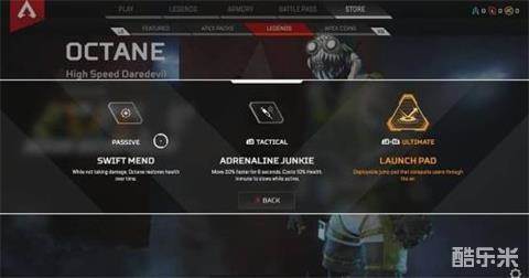 根据图中的技能介绍,Octane的被动会在不受到伤害时主动回复生命值;主动技能可以消耗10%生命值来在6秒内增加30%移速,并且对减速效果免疫;大招能够部署一个弹射板,将玩家弹射到空中。