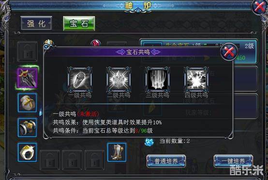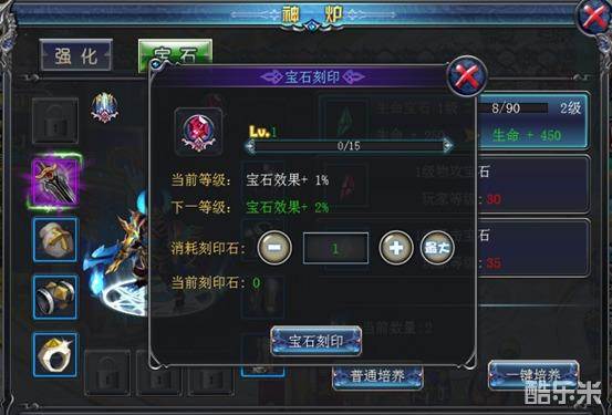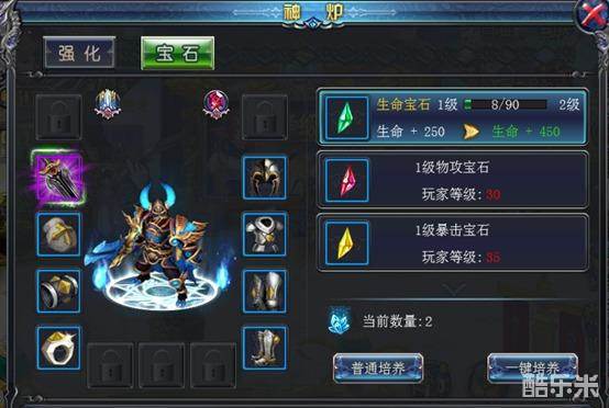 每个武器拥有4种宝石,随着人物等级逐步开启。升级宝石可以获得大量人物属性,宝石通过消耗宝石精华升级,宝石精华可以在活动或商城中获得。