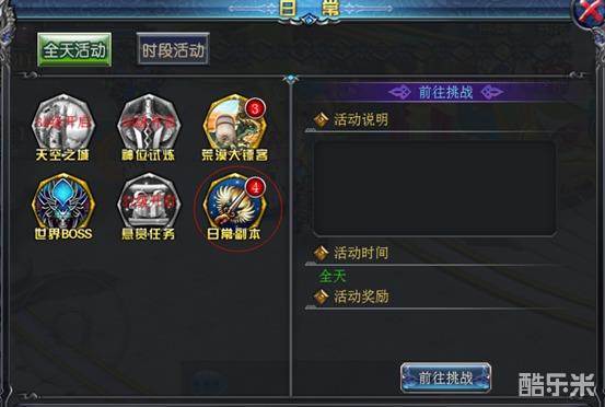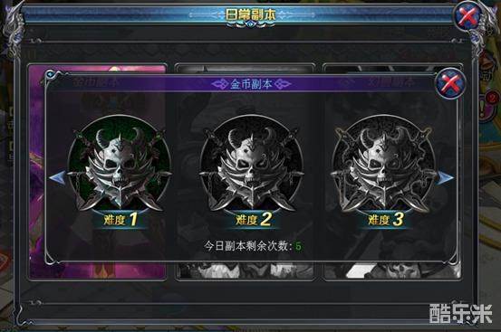 日常副本有三种类型,金币副本,材料副本和幻兽副本,对应奖励为金币,装备材料,幻兽材料。每个副本每天只能进入5次,每个副本有进入时间限制: