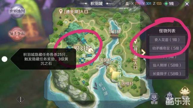 任务说明:积羽城内找到可爱的食人花苗(1级)和幼矛嘴奇足(5级)各打死25只,就可以获得隐藏任务奖励了。