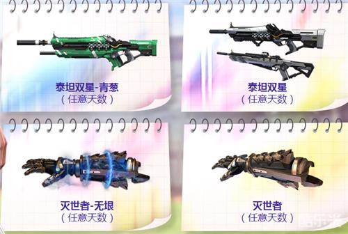 奖励有:泰坦双星-青葱(任意天数)、泰坦双星(任意天数)、灭世者-无垠(任意天数)、灭世者(任意天数)